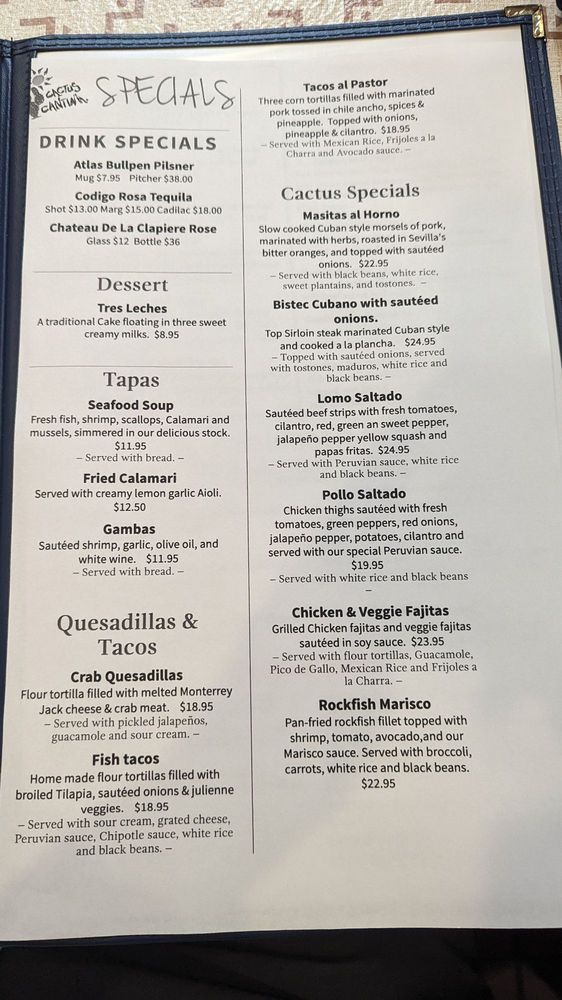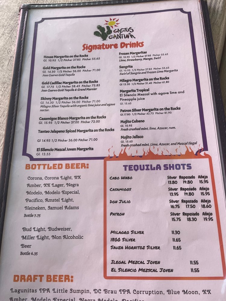 Introducing the menu at Cactus Cantina, located in Washington DC, where Tex-Mex and Mexican cuisine meets cocktail bar vibes. This casual spot offers outdoor seating, vegan and vegetarian options, and a full bar with happy hour specials. Customers praise the fresh and delicious food, mentioning favorites like the Guadalajara Platter and the ceviche. Regulars appreciate the consistency in quality and service over the years, with some noting the increasing prices. The spacious restaurant is great for groups and families, with fast and efficient service even during busy times. Don't miss out on the homemade chips and salsa, refreshing frozen margaritas, and the variety of quesadilla options. Overall, Cactus Cantina offers a tasty and enjoyable dining experience with a lively atmosphere and friendly staff.